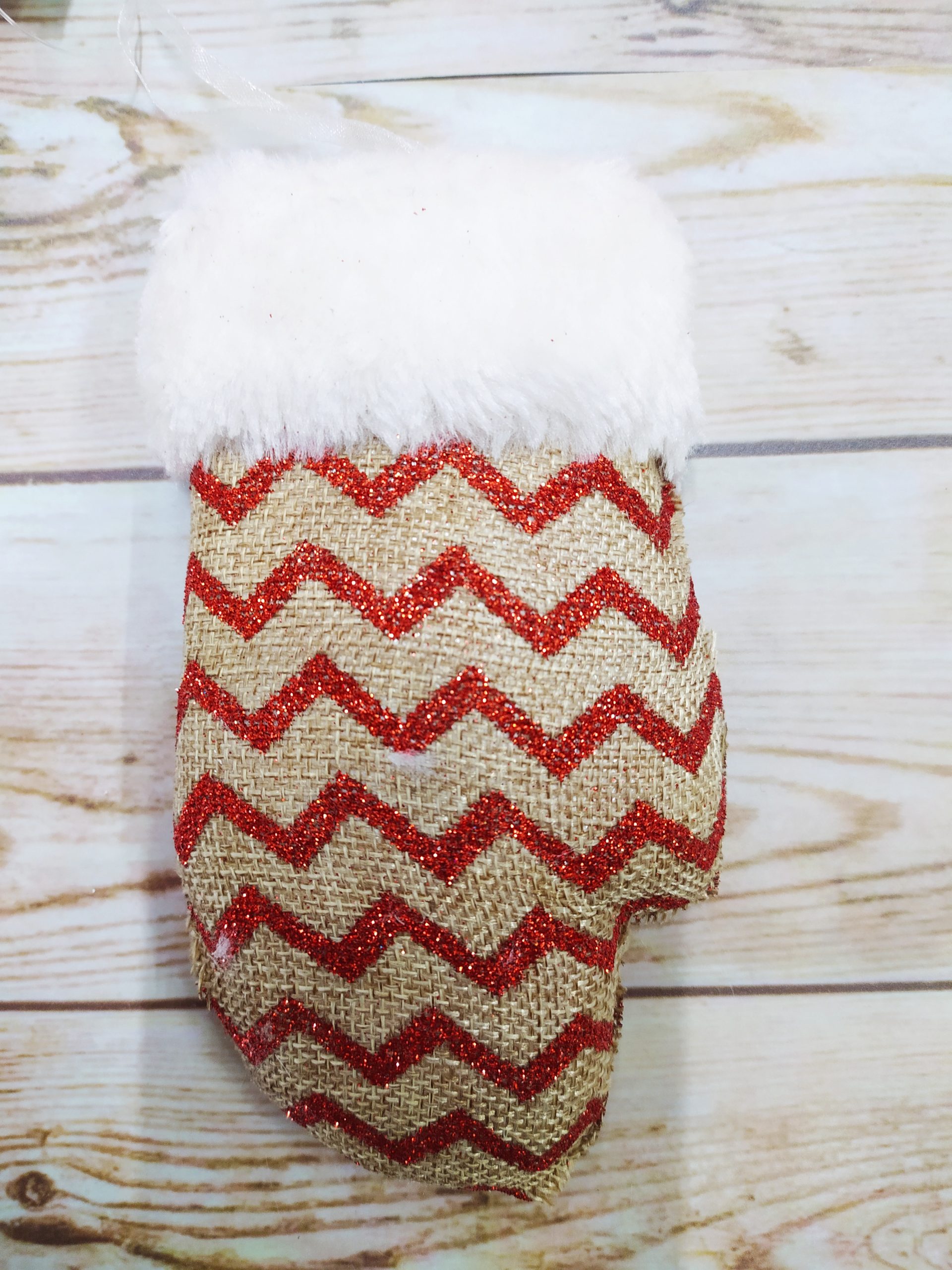 Adorno de Navidad, manopla en tela de saco y rojo. 12cm