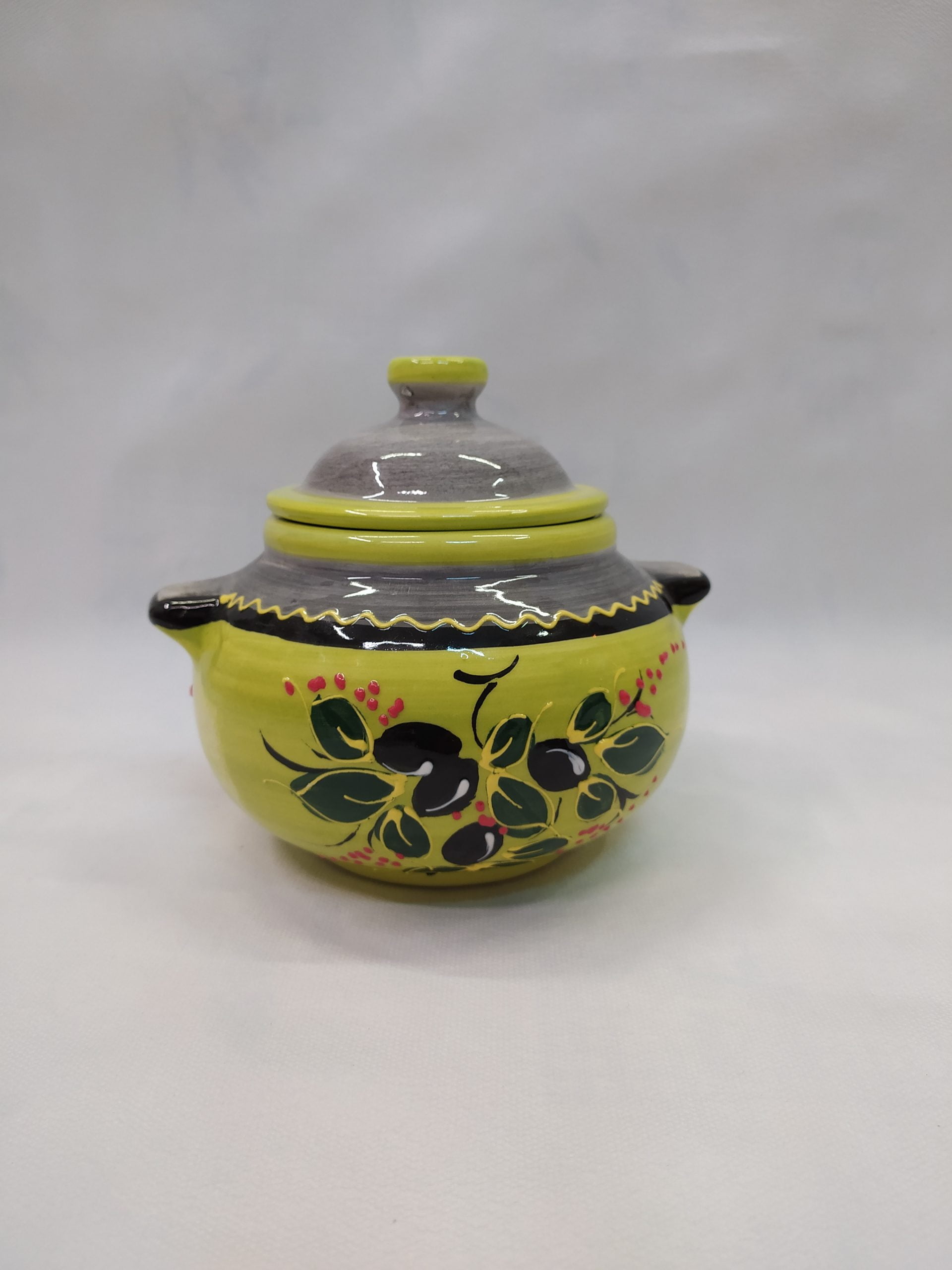 Azucarero de color verde con tapa, hecho de cerámica con motivos de aceitunas.