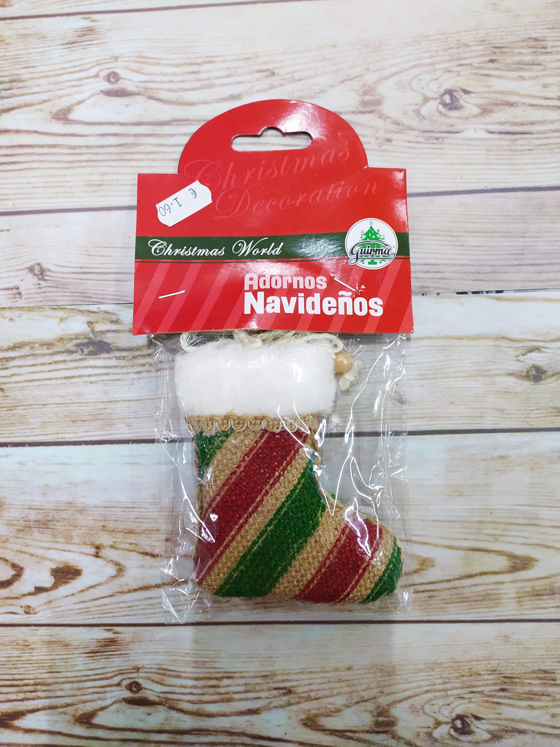 Adorno de Navidad en forma de bota, tela de saco marrón con motivos en verde y rojo.