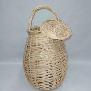 Caracolera grande de mimbre de dos colores. Con tapa y asa.