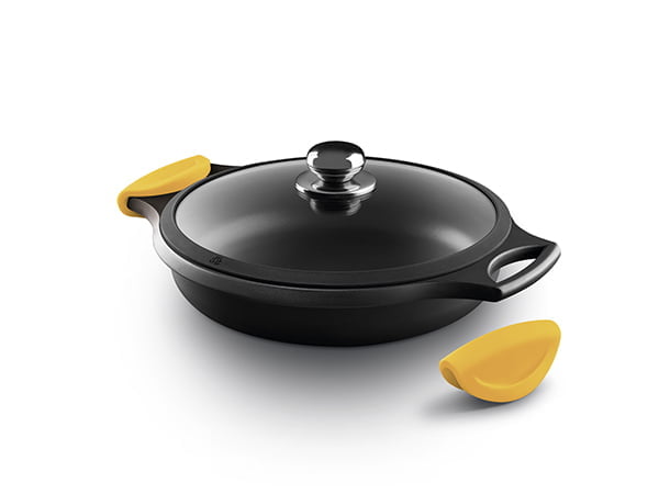 Cuerpo de aluminio fundido con asas desmontables de silicona, y tapa de cristal con aro protector anti impactos y pomo de acero inoxidable.