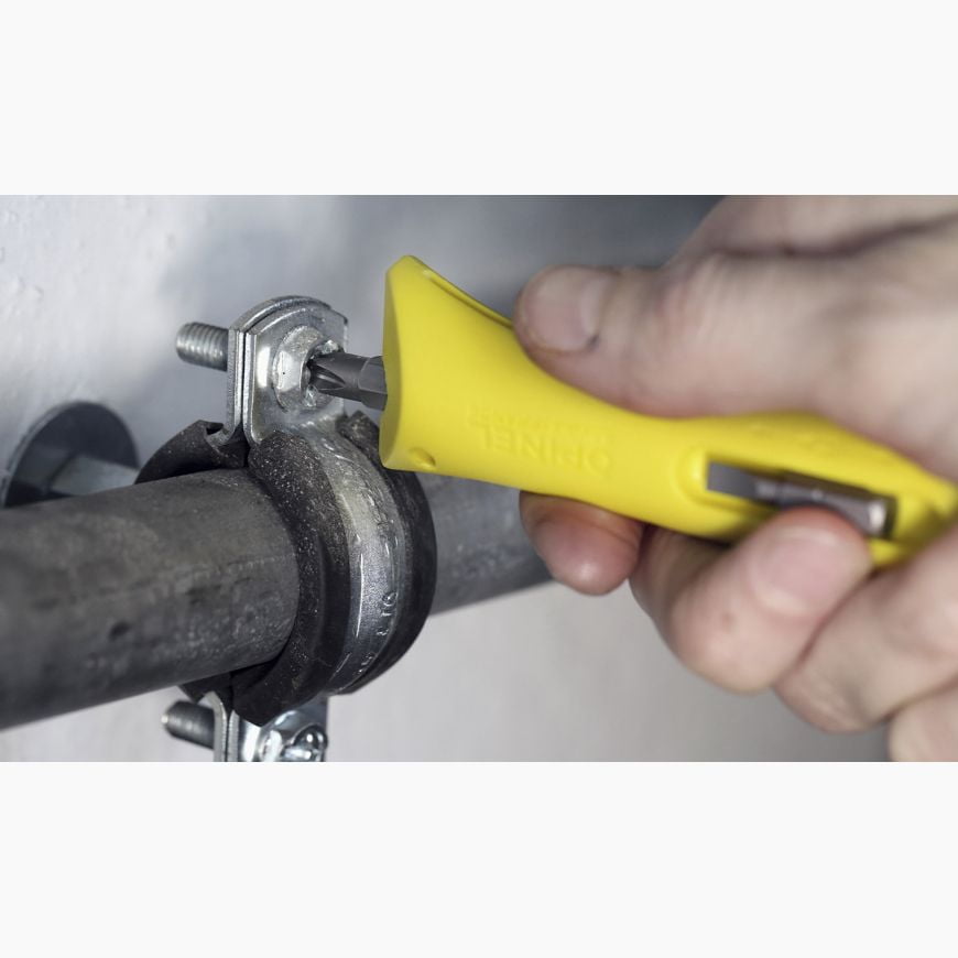 -El mango es de poliamida con carga de fibra de vidrio que garantiza una excelente resistencia a los golpes y al agua. Incluye dos boquillas estándar: destornillador plano (tornillos de 4 mm) y destornillador de estrella (tornillos de 3,5 a 5 mm), así como un portaboquillas magnético en el extremo del mango.