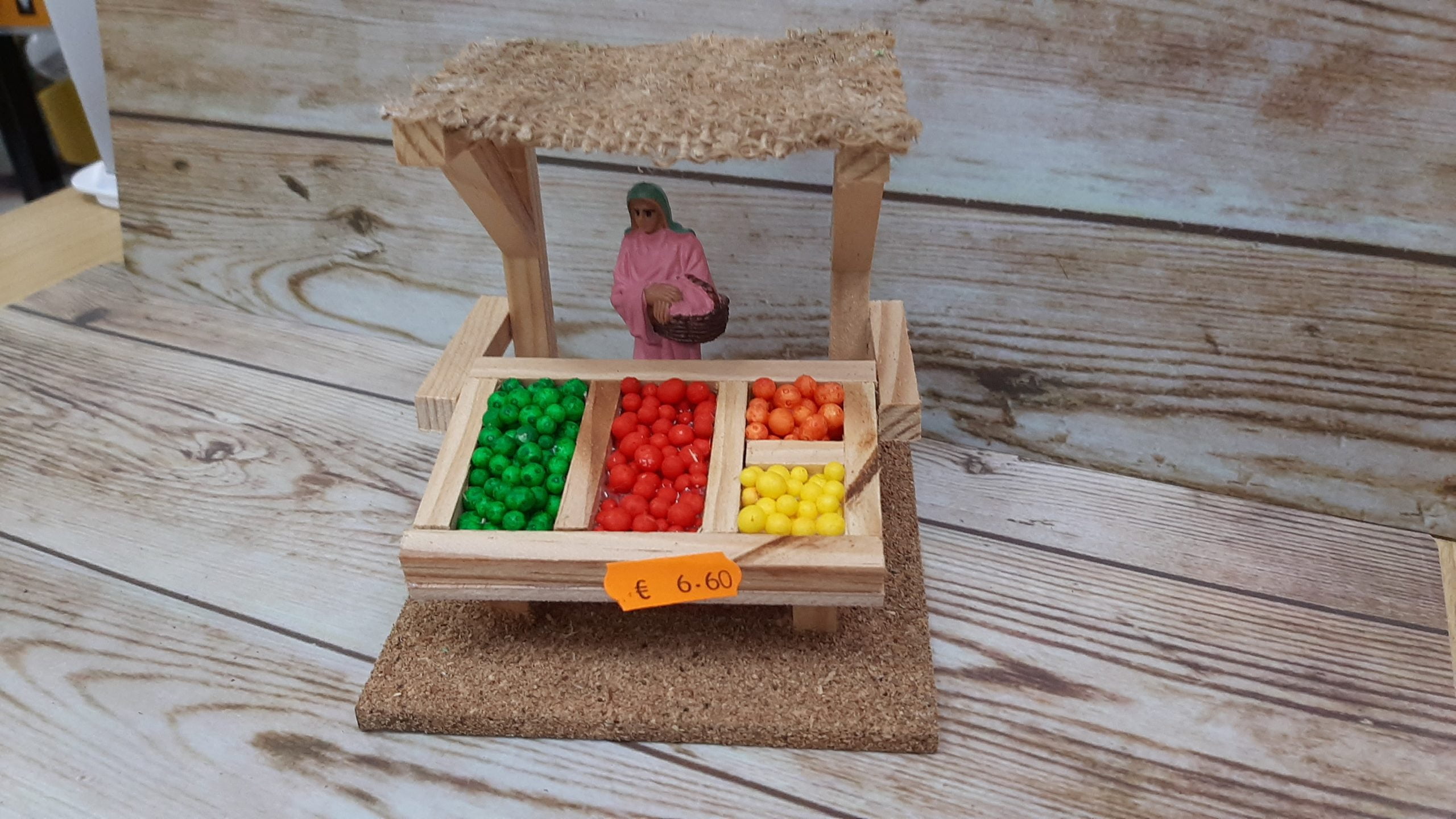 Fabricada en madera y corcho y con toldo. Incluye figura de señora en plástico.