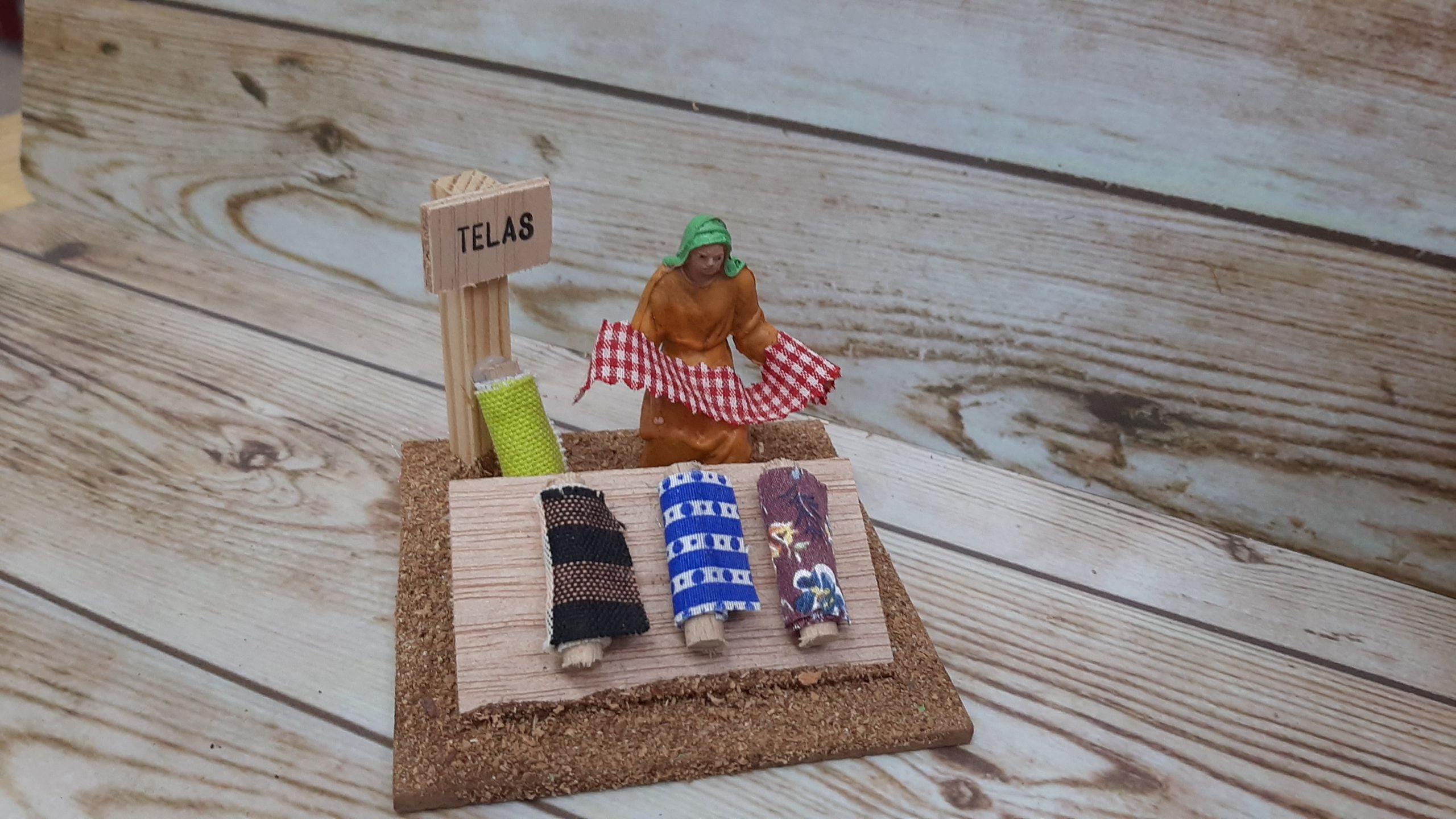 Pesebre – parada puesto de vender telas con cartel. 12cm