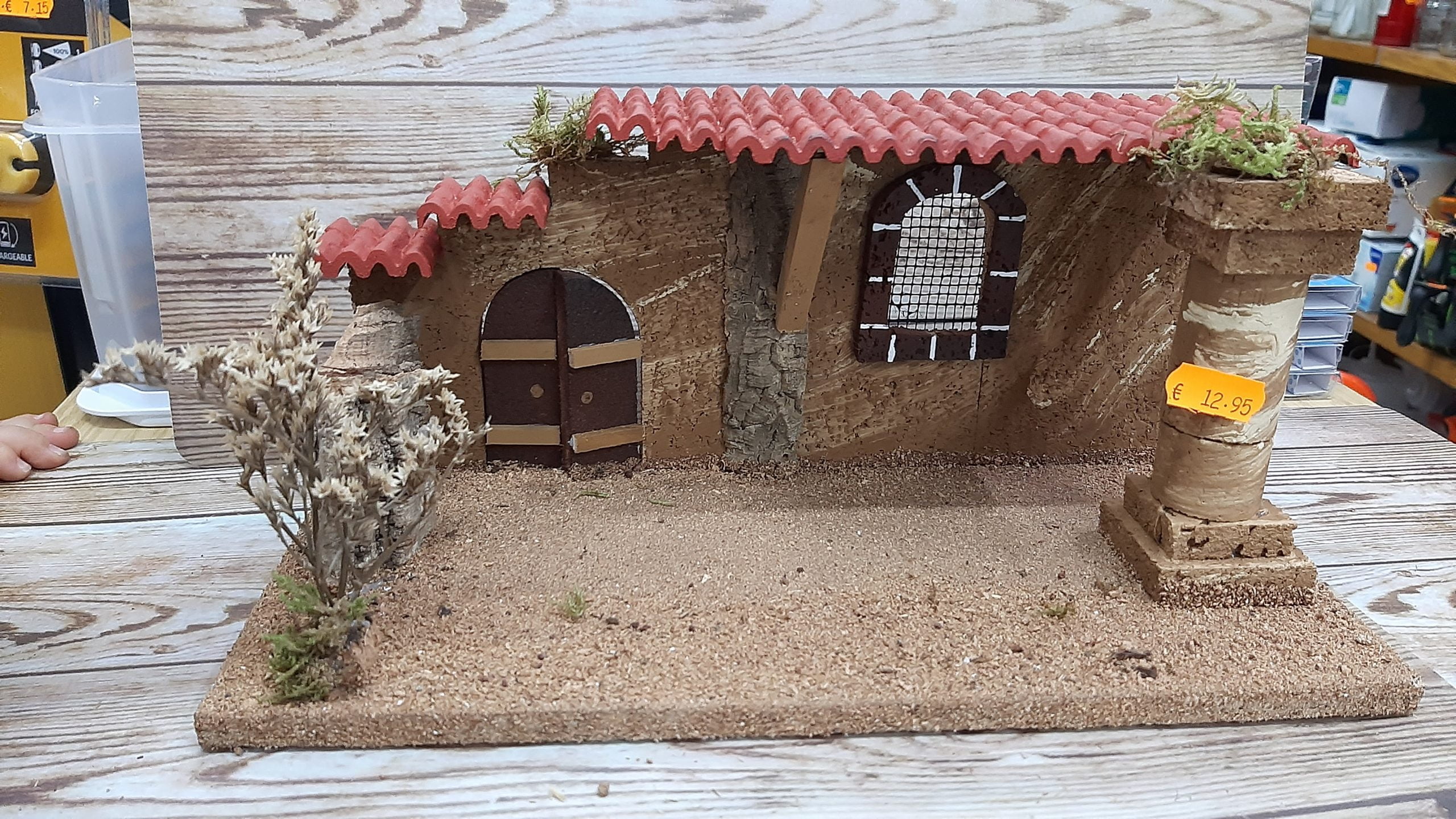 Portal belén nacimiento con tejado rojo, columna, puerta y ventana fabricado en corcho para pesebre.