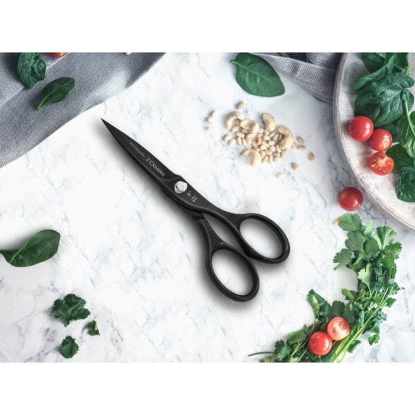 Tijera de cocina Chef en color negro de 8″ y 20 cm. forjada en caliente en acero inoxidable, con un recubrimiento PVD de Nitruro de Titanio.